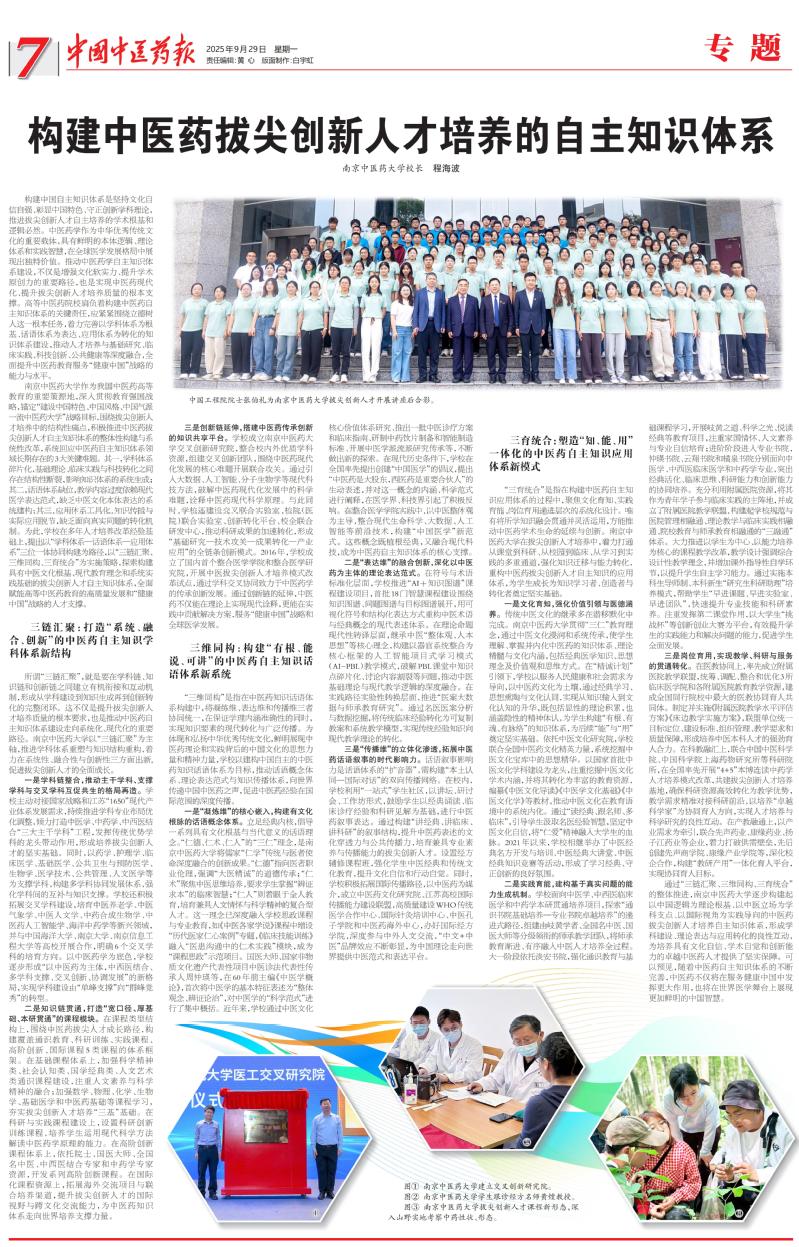 2025年9月29日,《中国中医药报》整版刊发程海波校长署名文章《构建中医药拔尖创新人才培养的自主知识体系》。全文内容如下。