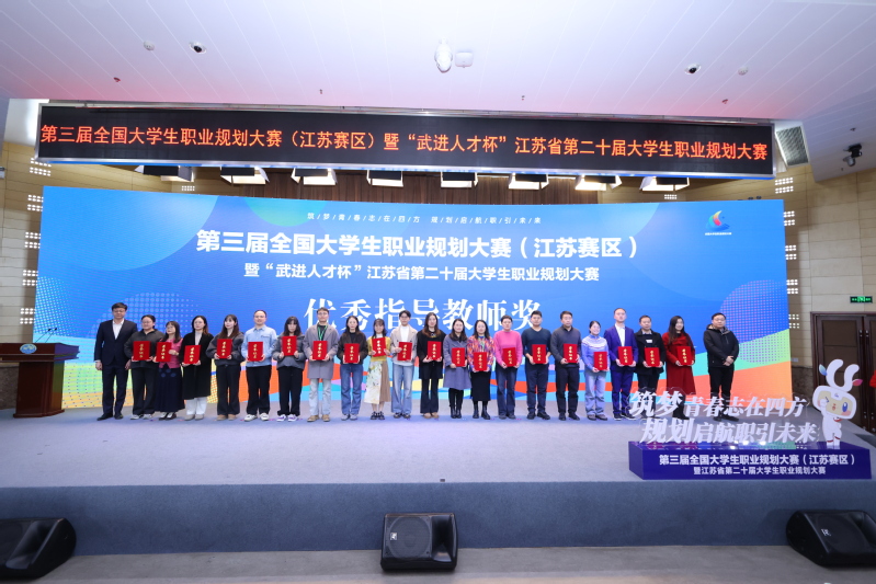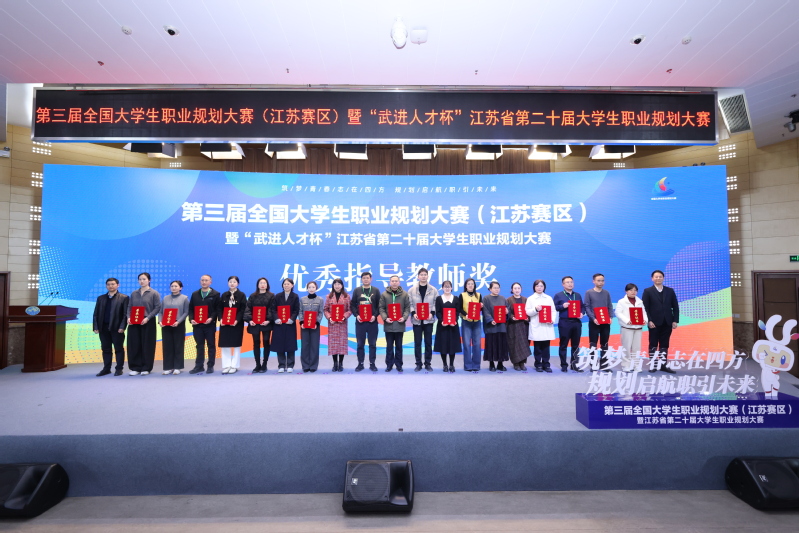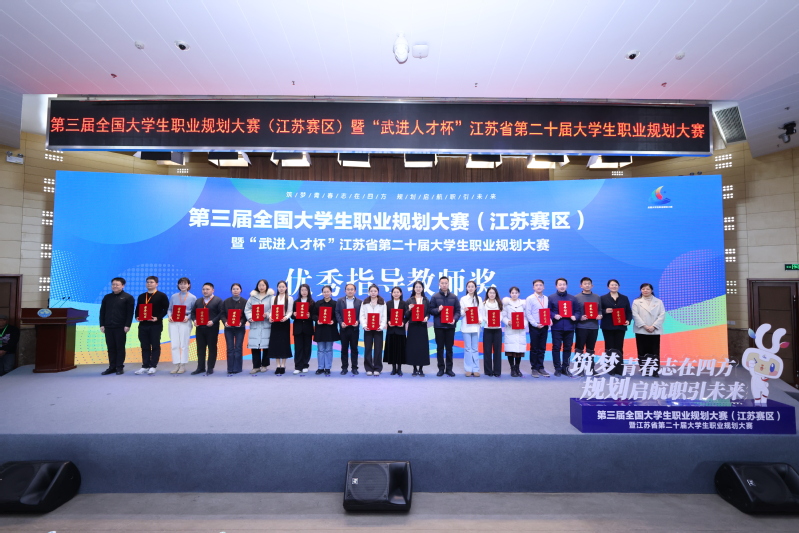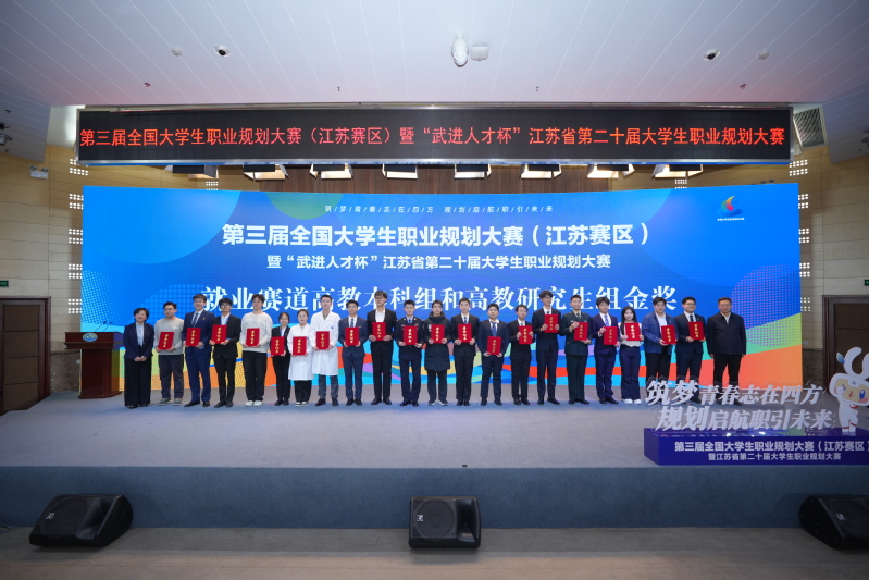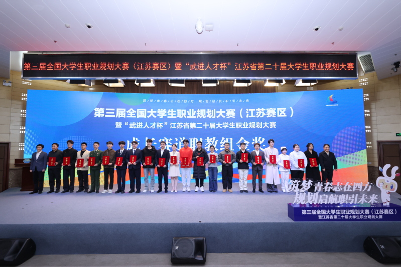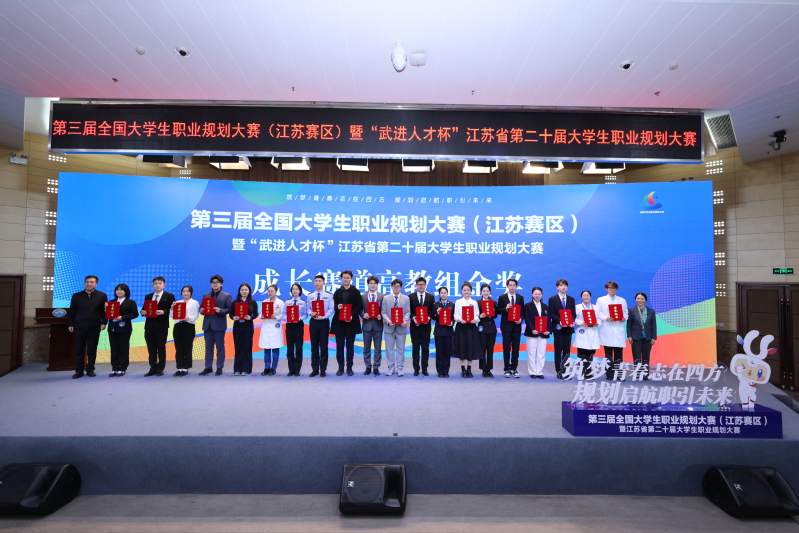 2025年12月27日至28日,由江苏省教育厅主办的第三届全国大学生职业规划大赛(江苏赛区)暨江苏省第二十届大学生职业规划大赛决赛在南京中医药大学和南京工业职业技术大学成功举办。教育部高校学生司(高校毕业生就业服务司)副司长吴爱华,江苏省教育厅副厅长陈艳,二级巡视员刘广鸣,常州市武进区人民政府副区长叶青,江苏省教育厅高校学生处处长王云慧,教师工作处处长张卫星,省教育厅相关部门,常州市武进区人社局负责人,南京中医药大学党委副书记、校长程海波,党委常委、副校长赵霞,南京师范大学党委副书记孙友莲,南京工业职业技术大学党委副书记、校长何学军等出席颁奖仪式。颁奖活动由江苏省高校招生就业指导服务中心主任缪榕楠主持。